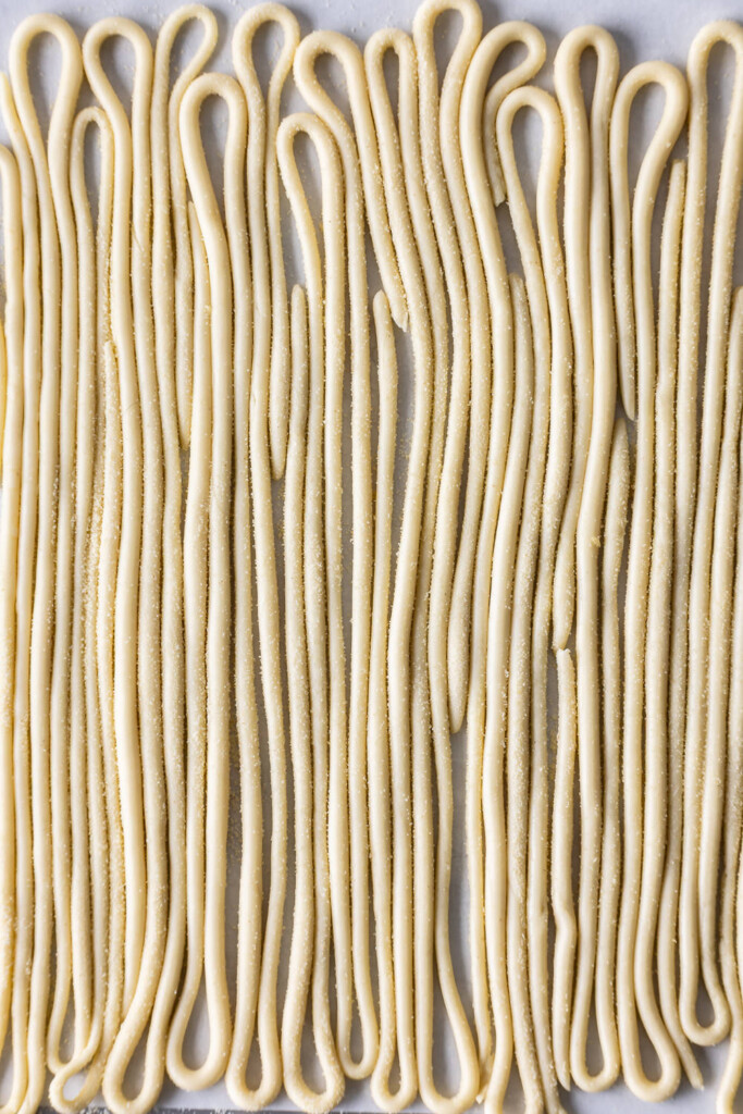 - Starting from the right end of a strip, use the heel of your right hand to gently roll back and forth, creating tension and stretching the dough into a smooth rope about ¼”-inch thick. As you work down the strip, dip finished sections lightly in semolina to prevent sticking. Transfer finished noodles to a semolina-dusted tray and repeat with remaining dough. Pici can stay at room temperature for up to 2 hours, or frozen for up to 1 month.
